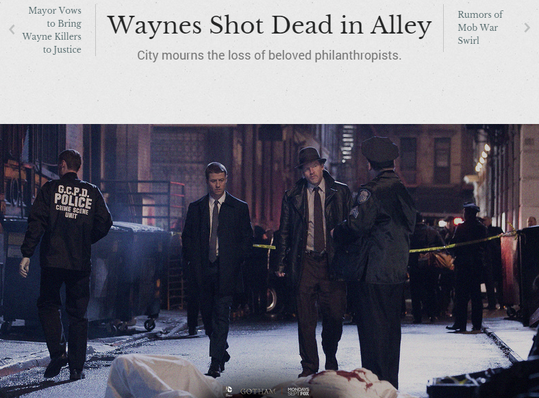 Part of the promotion for the Fox show Gotham, which premiers Sept 22 in the United States, has been the website gothamchronicle.com.  Thus far it has had a smattering of content, with some photos, and just a few stories, like the one that will undoubtedly be a striking moment in the pilot episode — the death of Thomas and Martha Wayne, the parents of Bruce Wayne who will grow up to be Batman.